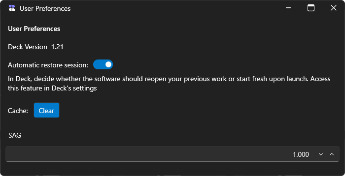 - Automatic restore session : decide if each time you open Deck if it should reopen your previous work or start fresh upon launch.