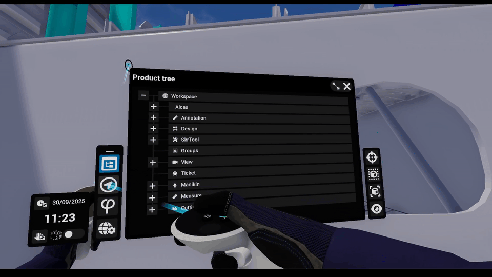 The Tablet is the central interaction hub within skyreal's functionalities. It allows users to launch or edit any feature, or interact with 3D elements directly inside the VR environment. The tablet by default is attached to user's hand, but is possible also to make it float in front of the user and can be summoned or dismissed as needed.